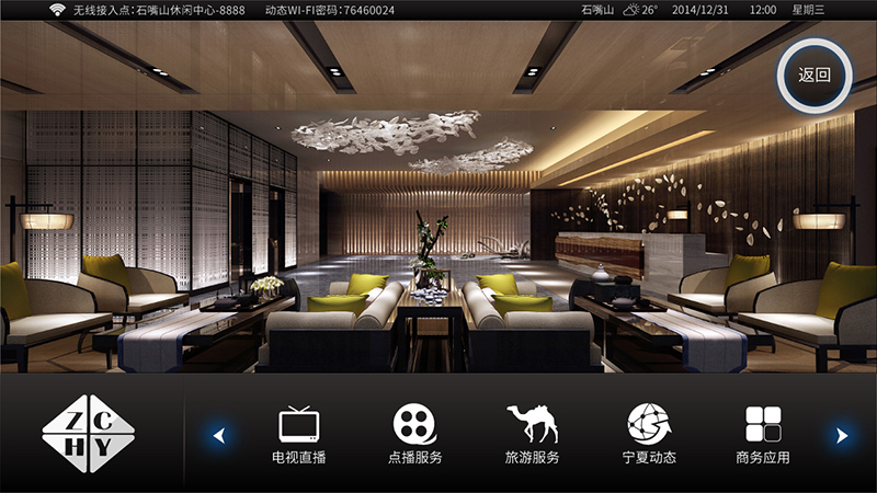 石嘴山酒店 新聞來(lái)源:宏輝智通 發(fā)布日期:2016-01-04 瀏覽次數(shù):16149 1.石嘴山酒店終端歡迎界面: 2.石嘴山酒店終端主界面: 上一篇:唐山金鼎大酒店 下一篇:星宇國(guó)際大酒店