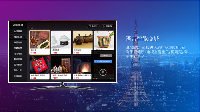 說“商城”,直接進入酒店商城應(yīng)用,剁剁手更健康,電視上看寶貝,更清楚,剁手更容易了。