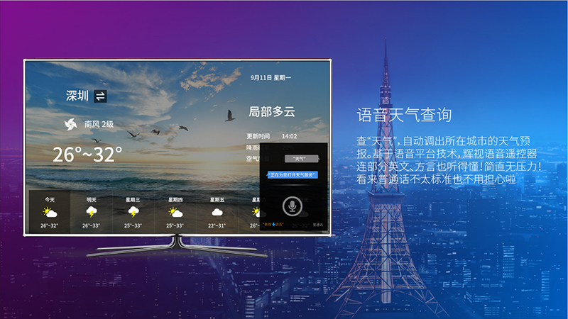 查“天氣”,自動調(diào)出所在城市的天氣預(yù)報?;谡Z音平臺技術(shù),輝視語音遙控器連部分英文、方言也聽得懂!簡直無壓力!看來普通話不太標準也不用擔心啦