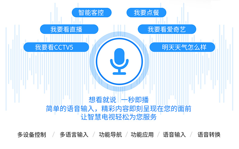 語音控制是電視智能化的標志之一,它具有語音控制換臺、關(guān)機、語音搜索影視、音樂資源等功能。不用遙控器、不用換電池,你說它聽,你說它做。區(qū)別于傳統(tǒng)遙控器的按鍵操作、拼音搜索,用戶只需語音對話,即可方便快捷地實現(xiàn)直播切換、點播搜索、應(yīng)用調(diào)取及百科查詢等功能,極大提升了iTV用戶操作中的靈活性與便捷性。不會說普通話?不用擔心 ,輝視語音遙控在語音識別引擎上,做了多語種識別。方言那又怎么樣?智能語音遙控器照樣說到做到。